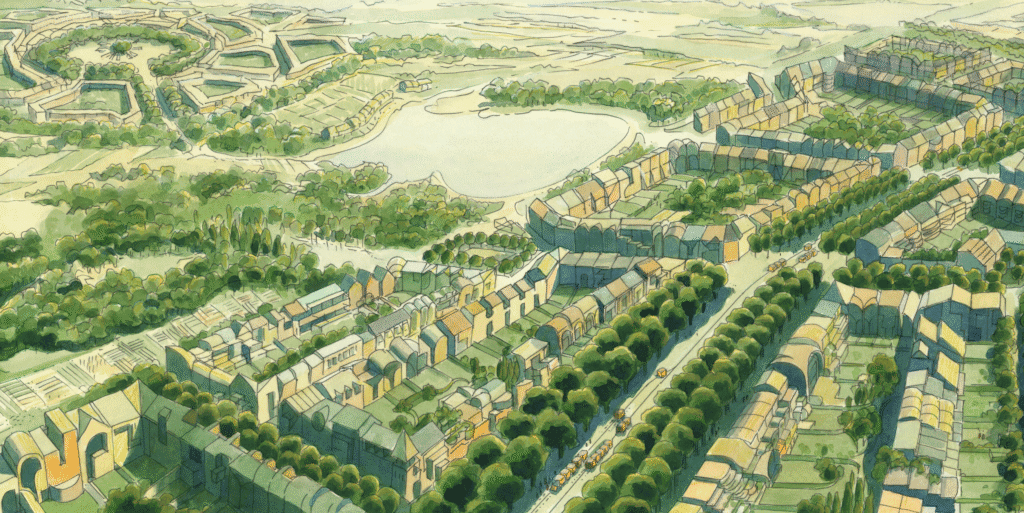 Comme tout ce qui provient du vivant, la cité se développe à partir d’une cellule originelle pour grandir jusqu’à une douzaine de cellules. Les voitures n’entrent jamais dans la cité. Le transport en commun est assuré par un tram modulaire circulant autour d’un boulevard périphérique. Alimenté en énergie par un rail électrique, Il est constitué d’un convoi de petits modules pour 4 adultes. Chaque module est autonome, il ne s’arrête que dans les voies de garage. La vitesse du parcours est particulièrement élevée par l’absence de carrefours et à la circulation ininterrompue, jusqu’à sa destination finale. Le grand arbre central prend le modèle de l’arbre à palabres africain. Il est le lieu de la permadémocratie, l’endroit où se prennent toutes les décisions concernant la cité.